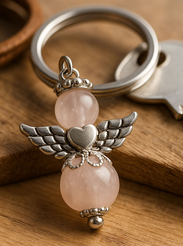 Dieses Rosenquarz-Engelchen entsteht in sorgfältiger Handarbeit. Kopf und Bauch bestehen aus zwei Kugeln, deren Rosanuancen von hellem Blütenrosa bis hin zu etwas tieferen Rosétönen reichen können. Manche Steine schimmern milchig, andere klar, manche zeigen feine Linien wie winzige, stille Botschaften.