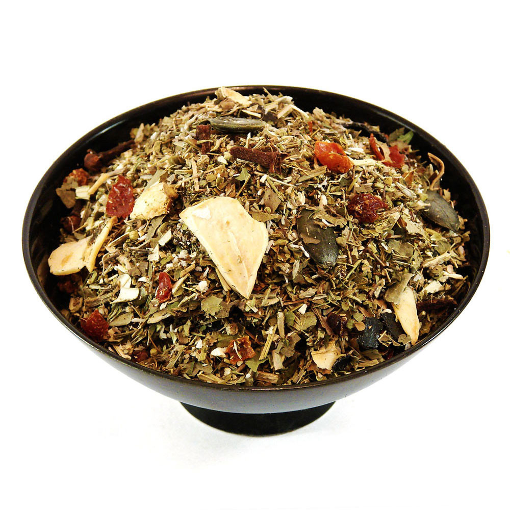 Wermutkraut, Walnussblätter, Thymian, Kokosraspeln, Kürbiskerne ohne Schale, Meerrettichgranulat, Olivenblätter, Hagebutten Südam., Schwarzkümmelsamen, Oregano, Esparsette, Labkraut, Erdrauchkraut, Papayablätter, Portulakkraut, Knoblauch, Quassiaholz, Myrrhenharz, Nelken, Zitwerwurzel, Papayakerne, Schwarzkümmelöl